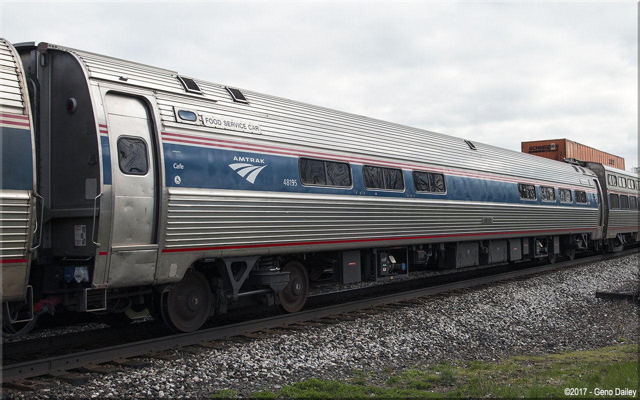 Built as an Amclub with 18 club seats, snack bar and 23 coachs seats in May 1976 and numbered 20133. Converted to having 33 club seats in February 1977 and renumbered 20671. Refurbished for Metroliner Service in July 1983 and renumbered 20971. Trainline-equipped for push-pull operation in January 1991 and renumbered 48971. Converted to a Club-Dinette with 18 club seats and 6 four-place booths in October 2006 and renumbered 48195. This car is one of a small group of Amfleet I cars that had at least 5 different numbers in its career. Historical information about this car provided by www.amtrakbythenumbers.com. |