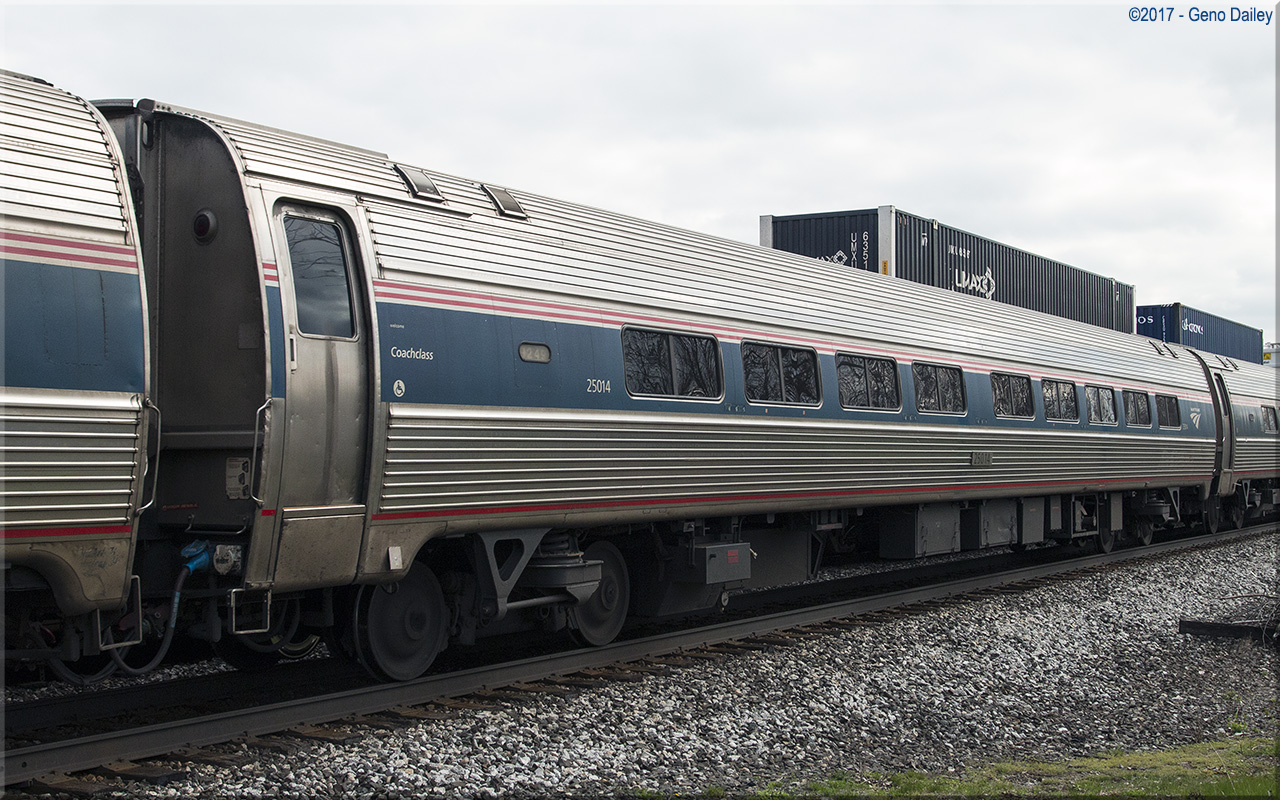 Built by Budd as a 59 seat long-distance coach in January 1982 and numbered 25014. The single seat was located near the the accessible restroom in the vestibule end of the car for use by a physically challenged passenger. The single seat has since been removed and a normal double-seat is now available and today these cars are equipped with a total of 58 seats. Historical information about this car provided by www.amtrakbythenumbers.com. |