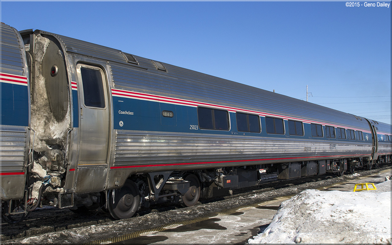Built by Budd as a 59 seat long-distance coach in April 1982 and numbered 25023. The single seat was located near the the accessible restroom in the vestibule end of the car for use by a physically challenged passenger. The single seat has since been removed and a normal double-seat is now available and today these cars are equipped with a total of 58 seats. Historical information about this car provided by www.amtrakbythenumbers.com. |
