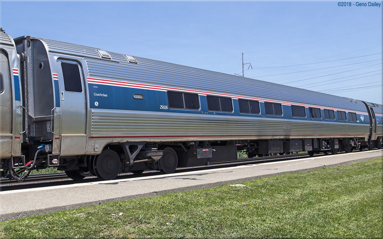 Built by Budd as a 59 seat long-distance coach in April 1982 and numbered 25026. Refurbished with a baggage area in place of four seats near the vestibule end in 2002 for use on the Silver Palm and Carolinian Business Class and renumbered 26026. Converted back to its original configuration in 2007 and renumbered back to 25026. The original single seat was located near the the accessible restroom in the vestibule end of the car for use by a physically challenged passenger. The single seat has since been removed and a normal double-seat is now available and today these cars are equipped with a total of 58 seats. Historical information about this car provided by www.amtrakbythenumbers.com. |