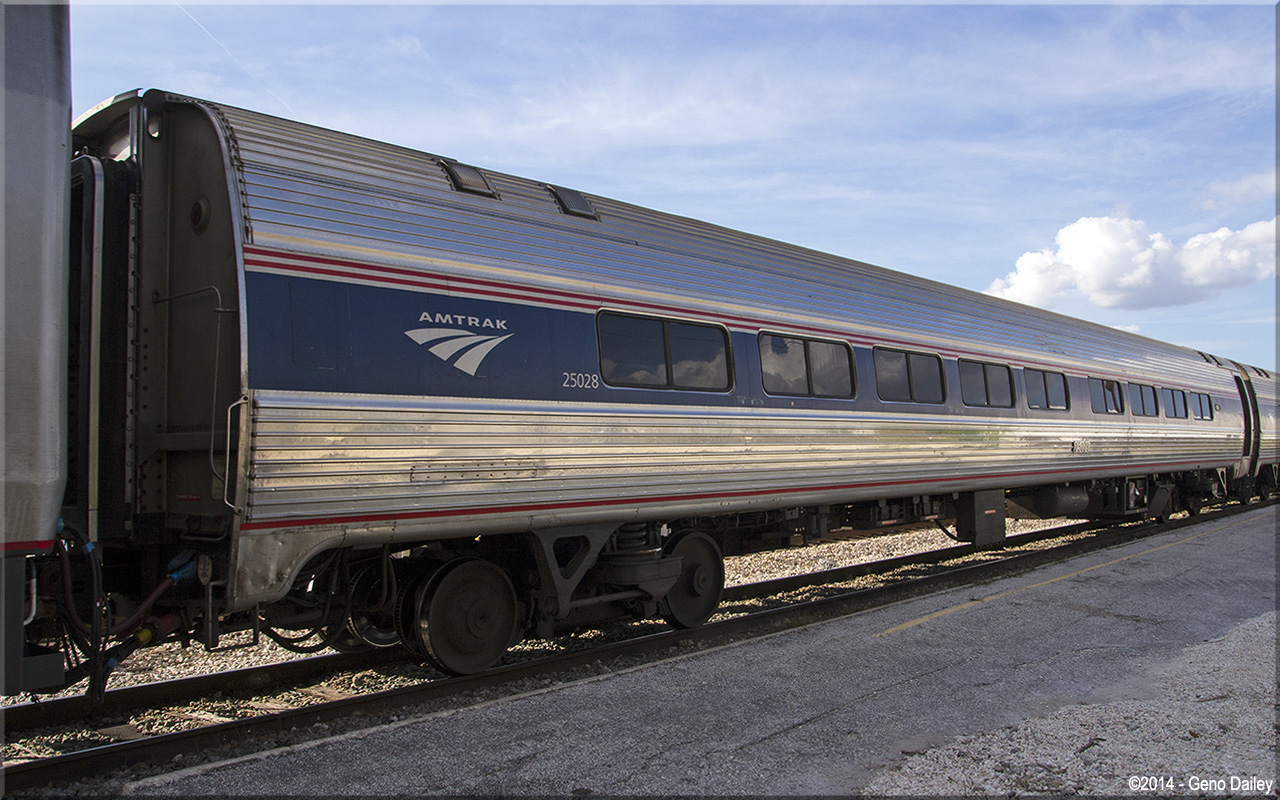 Built by Budd as a 59 seat long-distance coach in May 1982 and numbered 25028. The single seat was located near the the accessible restroom in the vestibule end of the car for use by a physically challenged passenger. The single seat has since been removed and a normal double-seat is now available and today these cars are equipped with a total of 58 seats. Historical information about this car provided by www.amtrakbythenumbers.com. |