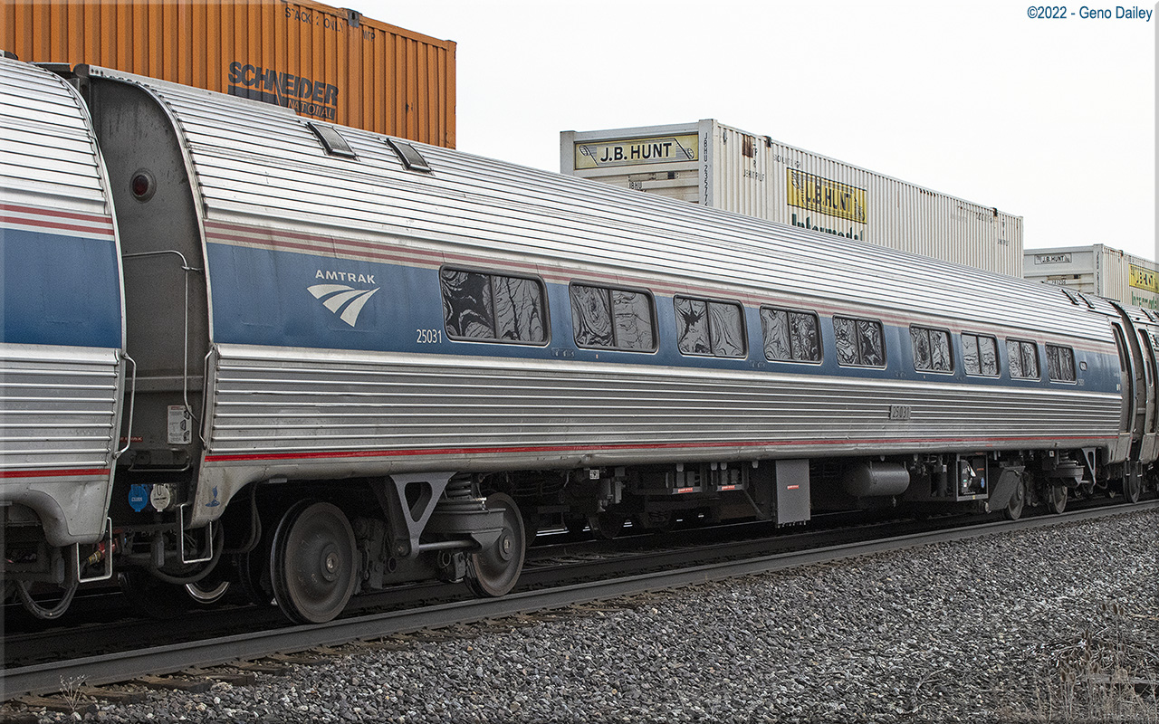 Built by Budd as a 59 seat long-distance coach in February 1982 and numbered 25031. The single seat was located near the the accessible restroom in the vestibule end of the car for use by a physically challenged passenger. The single seat has since been removed and a normal double-seat is now available and today these cars are equipped with a total of 58 seats. Historical information about this car provided by www.amtrakbythenumbers.com. |