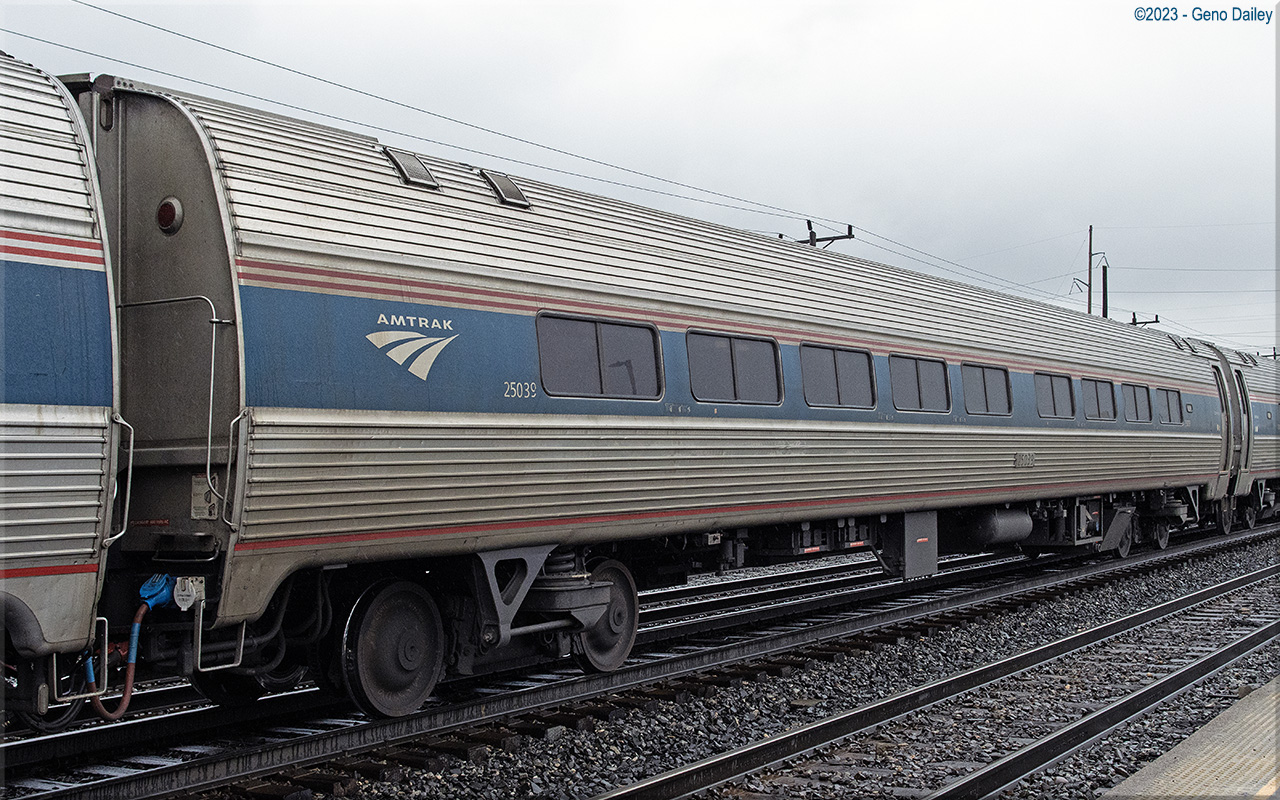 Built by Budd as a 59 seat long-distance coach in April 1982 and numbered 25039. The single seat was located near the the accessible restroom in the vestibule end of the car for use by a physically challenged passenger. The single seat has since been removed and a normal double-seat is now available and today these cars are equipped with a total of 58 seats. Historical information about this car provided by www.amtrakbythenumbers.com. |