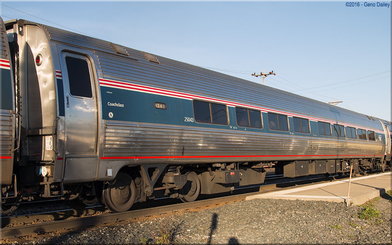 Built by Budd as a 59 seat long-distance coach in May 1982 and numbered 25043. The single seat was located near the the accessible restroom in the vestibule end of the car for use by a physically challenged passenger. The single seat has since been removed and a normal double-seat is now available and today these cars are equipped with a total of 58 seats. Historical information about this car provided by www.amtrakbythenumbers.com. |