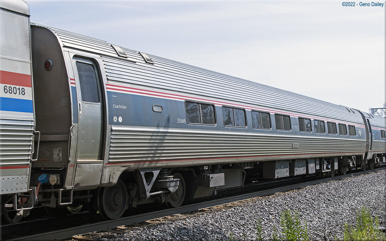 Built by Budd as a 59 seat long-distance coach in June 1982 and numbered 25049. Refurbished with a baggage area in place of four seats near the vestibule end in 2002 for use on the Silver Palm and Carolinian Business Class and renumbered 26049. Converted back to its original configuration in 2005 and renumbered back to 25049. The original single seat was located near the the accessible restroom in the vestibule end of the car for use by a physically challenged passenger. The single seat has since been removed and a normal double-seat is now available and today these cars are equipped with a total of 58 seats. Historical information about this car provided by www.amtrakbythenumbers.com. |