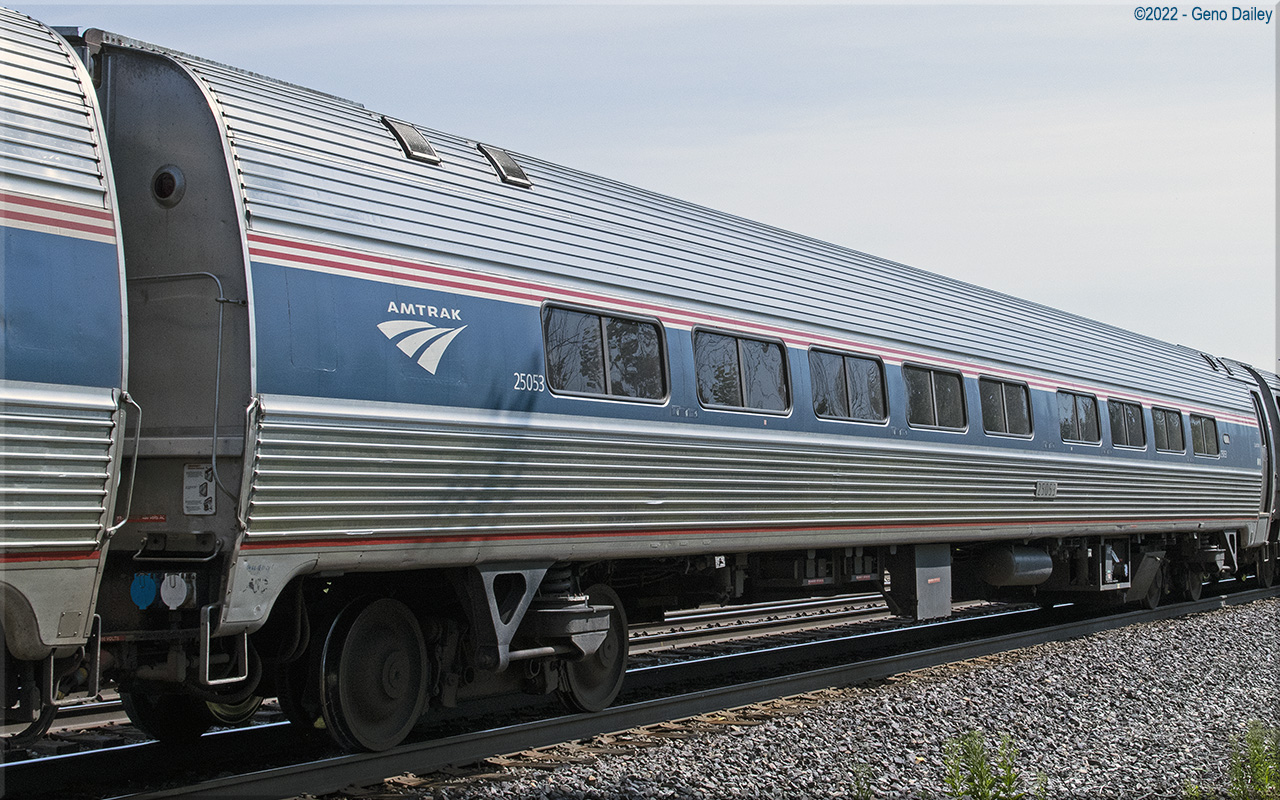Built by Budd as a 59 seat long-distance coach in June 1982 and numbered 25053. Refurbished with a baggage tower installed in 1988 and renumbered 26053. Converted back to its original configuration in November 2002 and renumbered back to 25053. The original single seat was located near the the accessible restroom in the vestibule end of the car for use by a physically challenged passenger. The single seat has since been removed and a normal double-seat is now available and today these cars are equipped with a total of 58 seats. Historical information about this car provided by www.amtrakbythenumbers.com. |