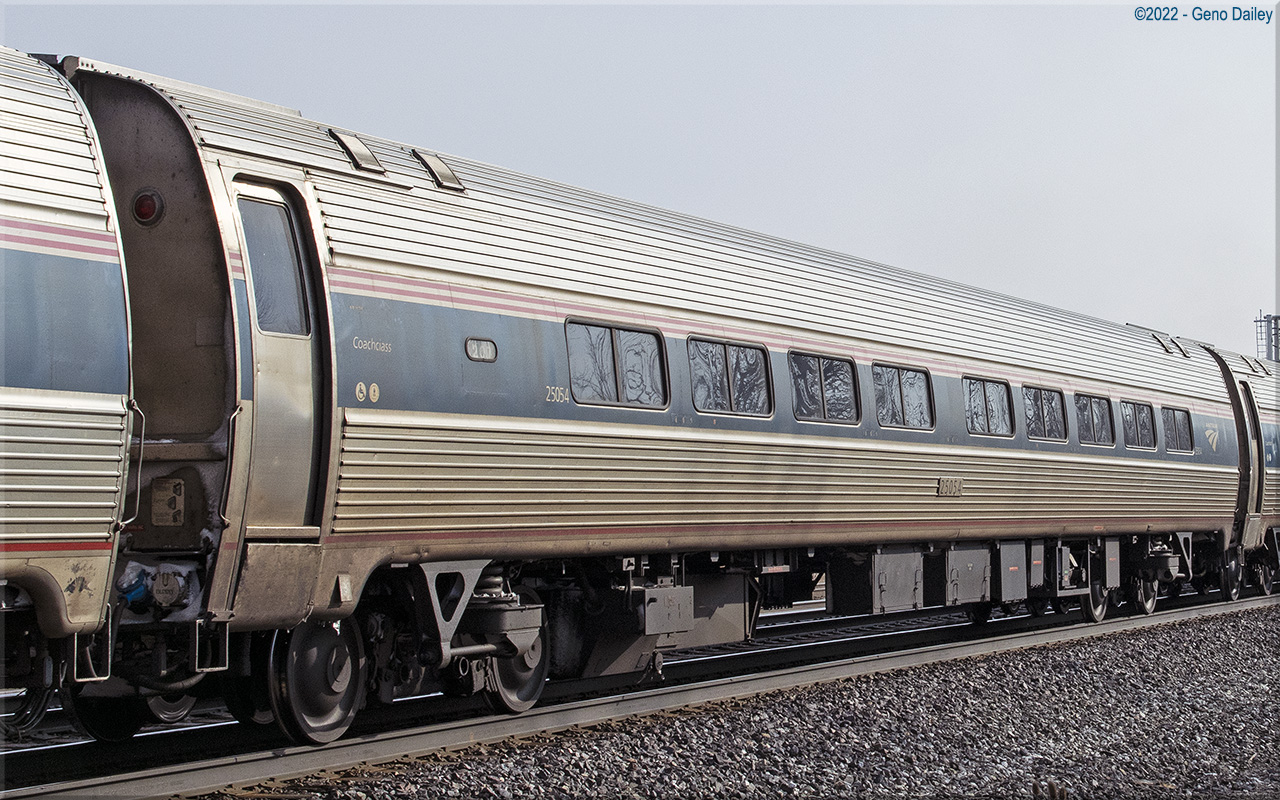 Built by Budd as a 59 seat long-distance coach in June 1982 and numbered 25054. The single seat was located near the the accessible restroom in the vestibule end of the car for use by a physically challenged passenger. The single seat has since been removed and a normal double-seat is now available and today these cars are equipped with a total of 58 seats. Historical information about this car provided by www.amtrakbythenumbers.com. |