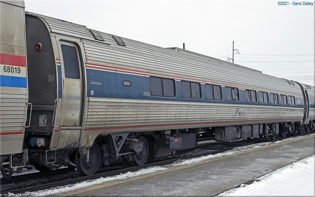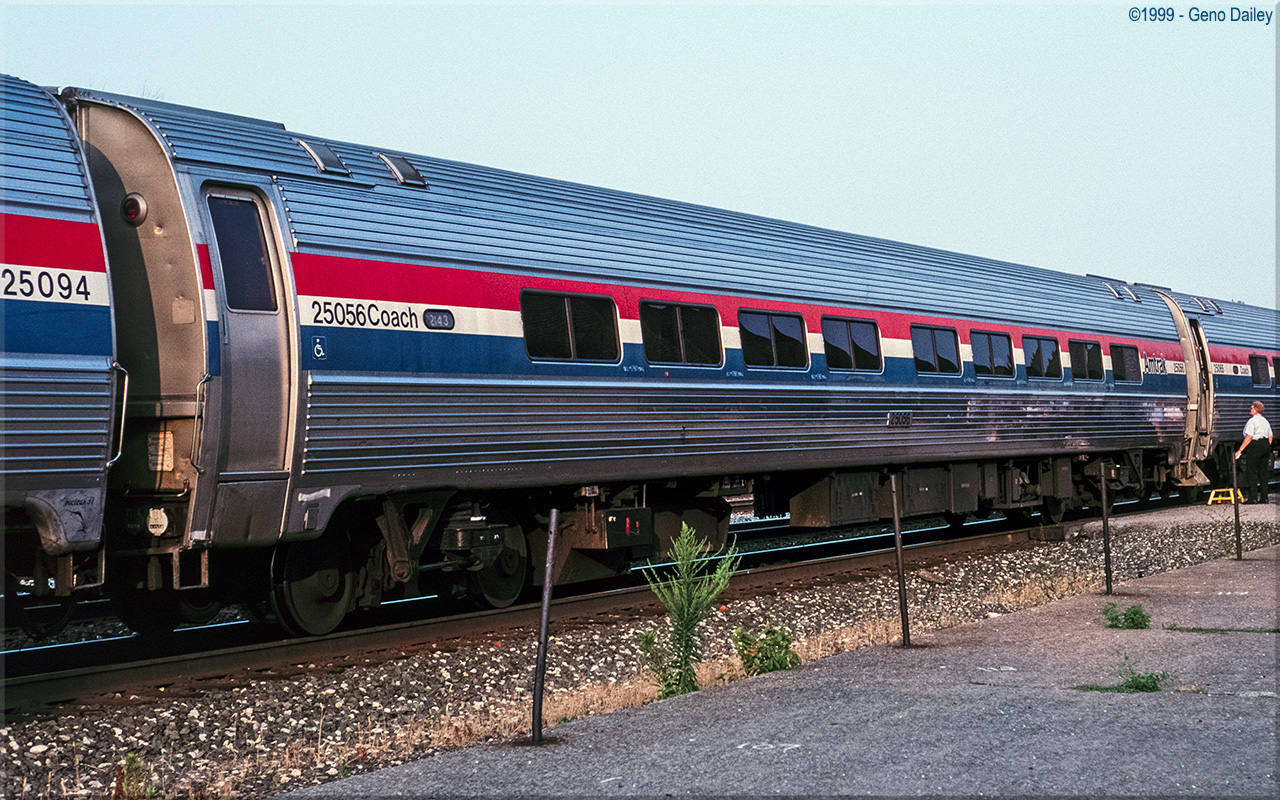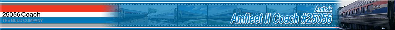 Built by Budd as a 59 seat long-distance coach in June 1982 and numbered 25056. The single seat was located near the the accessible restroom in the vestibule end of the car for use by a physically challenged passenger. The single seat has since been removed and a normal double-seat is now available and today these cars are equipped with a total of 58 seats. Historical information about this car provided by www.amtrakbythenumbers.com. |