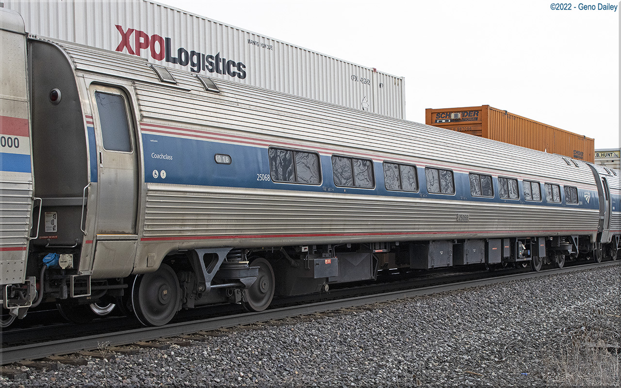 Built by Budd as a 59 seat long-distance coach in August 1982 and numbered 25068. The single seat was located near the the accessible restroom in the vestibule end of the car for use by a physically challenged passenger. The single seat has since been removed and a normal double-seat is now available and today these cars are equipped with a total of 58 seats. Historical information about this car provided by www.amtrakbythenumbers.com. |