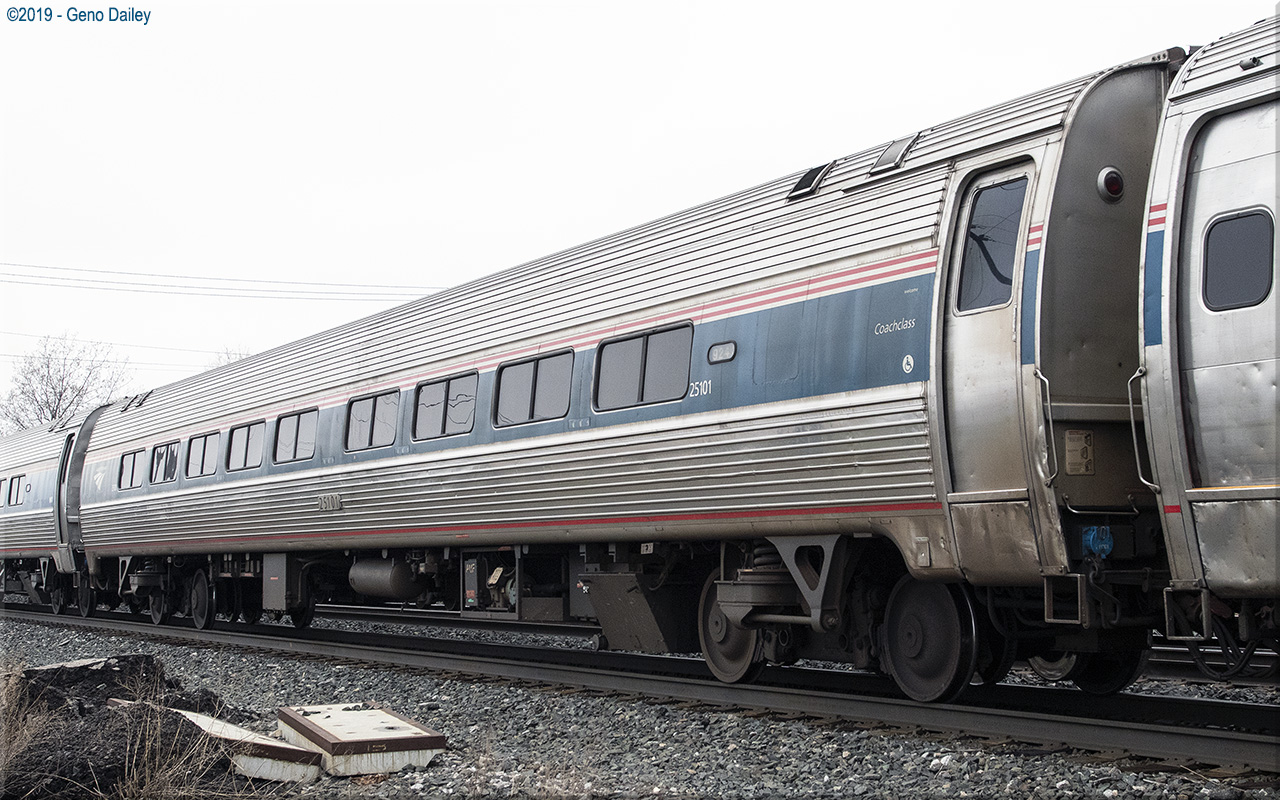 Built by Budd as a 59 seat long-distance coach in January 1983 and numbered 25101. The single seat was located near the the accessible restroom in the vestibule end of the car for use by a physically challenged passenger. The single seat has since been removed and a normal double-seat is now available and today these cars are equipped with a total of 58 seats. Historical information about this car provided by www.amtrakbythenumbers.com. |