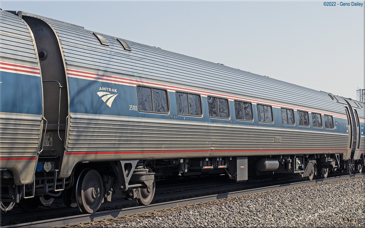 Built by Budd as a 59 seat long-distance coach in February 1983 and numbered 25103. The single seat was located near the the accessible restroom in the vestibule end of the car for use by a physically challenged passenger. The single seat has since been removed and a normal double-seat is now available and today these cars are equipped with a total of 58 seats. Historical information about this car provided by www.amtrakbythenumbers.com. |