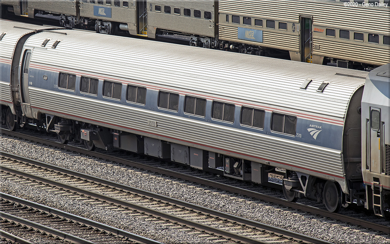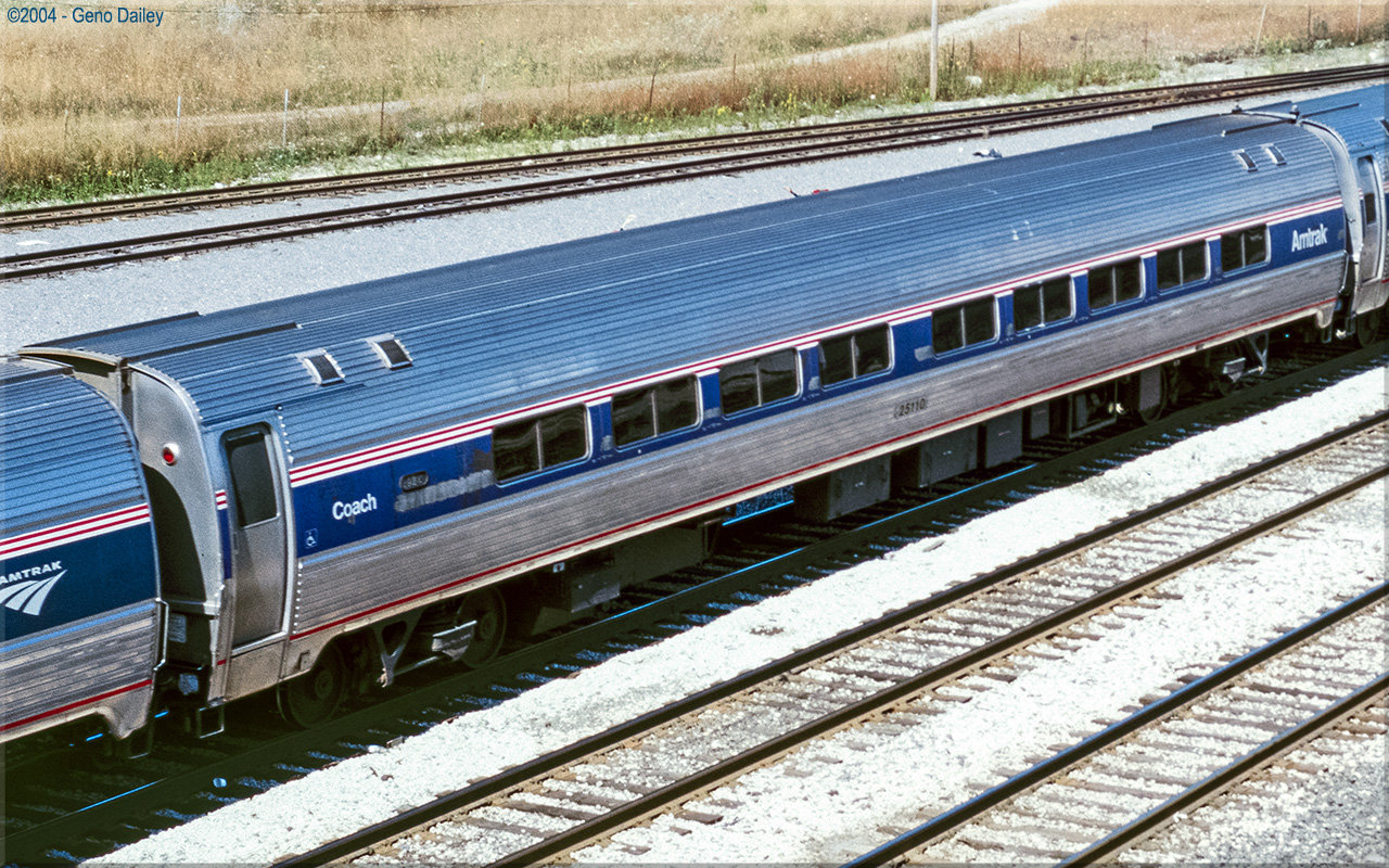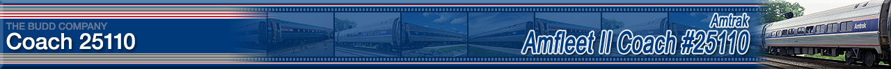 Built by Budd as a 59 seat long-distance coach in March 1983 and numbered 25110. The single seat was located near the the accessible restroom in the vestibule end of the car for use by a physically challenged passenger. The single seat has since been removed and a normal double-seat is now available and today these cars are equipped with a total of 58 seats. Historical information about this car provided by www.amtrakbythenumbers.com. |