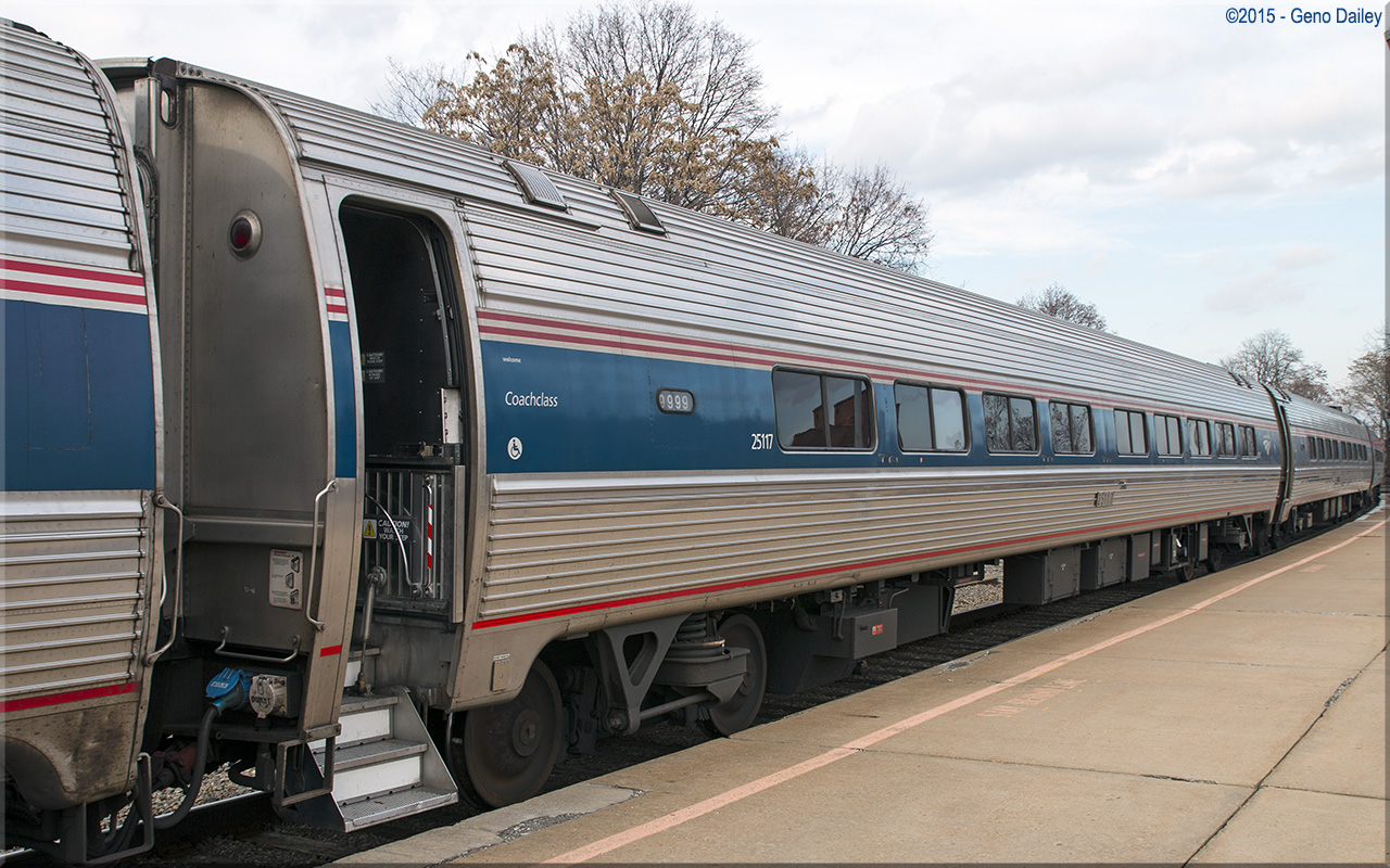Built by Budd as a 59 seat long-distance coach in March 1983 and numbered 25117. The single seat was located near the the accessible restroom in the vestibule end of the car for use by a physically challenged passenger. The single seat has since been removed and a normal double-seat is now available and today these cars are equipped with a total of 58 seats. Historical information about this car provided by www.amtrakbythenumbers.com. |
