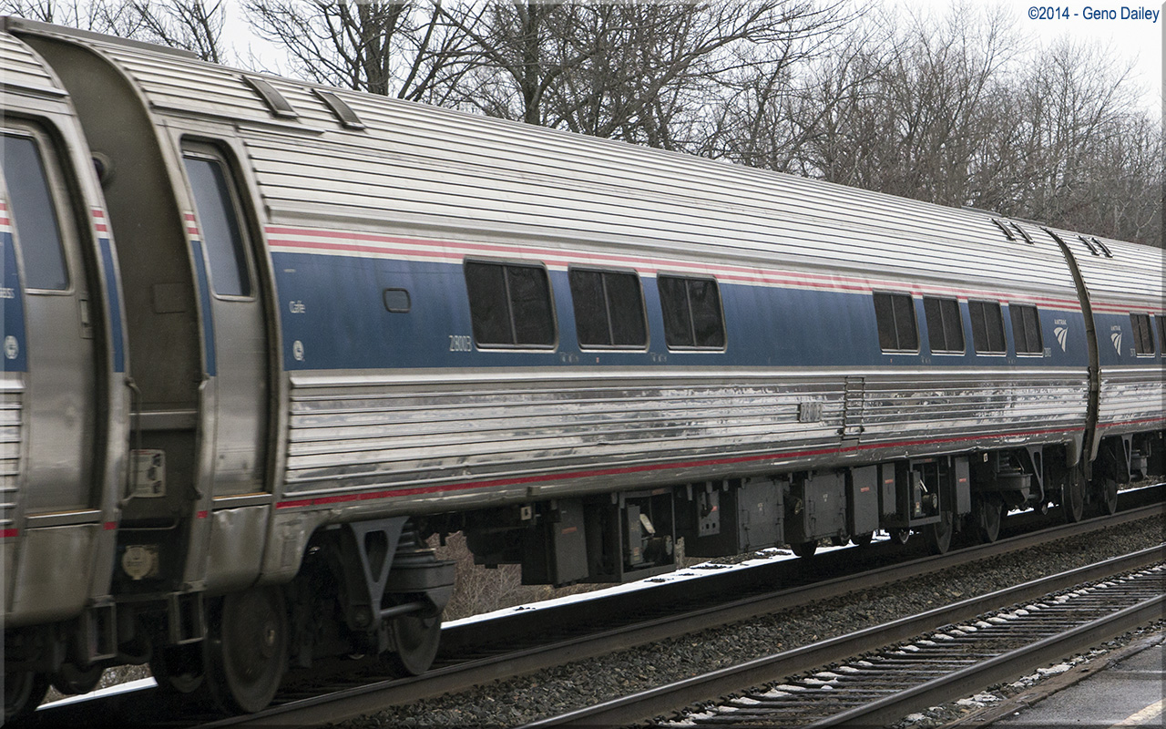 Built by Budd in February 1982 with an off-center snack bar with 10 4-place booths on the long end and 17 seats in 1, 2, and 4 seat configurations on the short end near the restroom and vestibule. Converted to a "Diner-Lite" car in May 2009 which involved removal of 3 tables on the long end, replaced by a conductor's office and storage space. The short end of the car received 19 seats arranged in two and four-seat booths. A small cooking facility was constructed in the car so these cars could be used as dining cars. Historical information about this car provided by www.amtrakbythenumbers.com. |