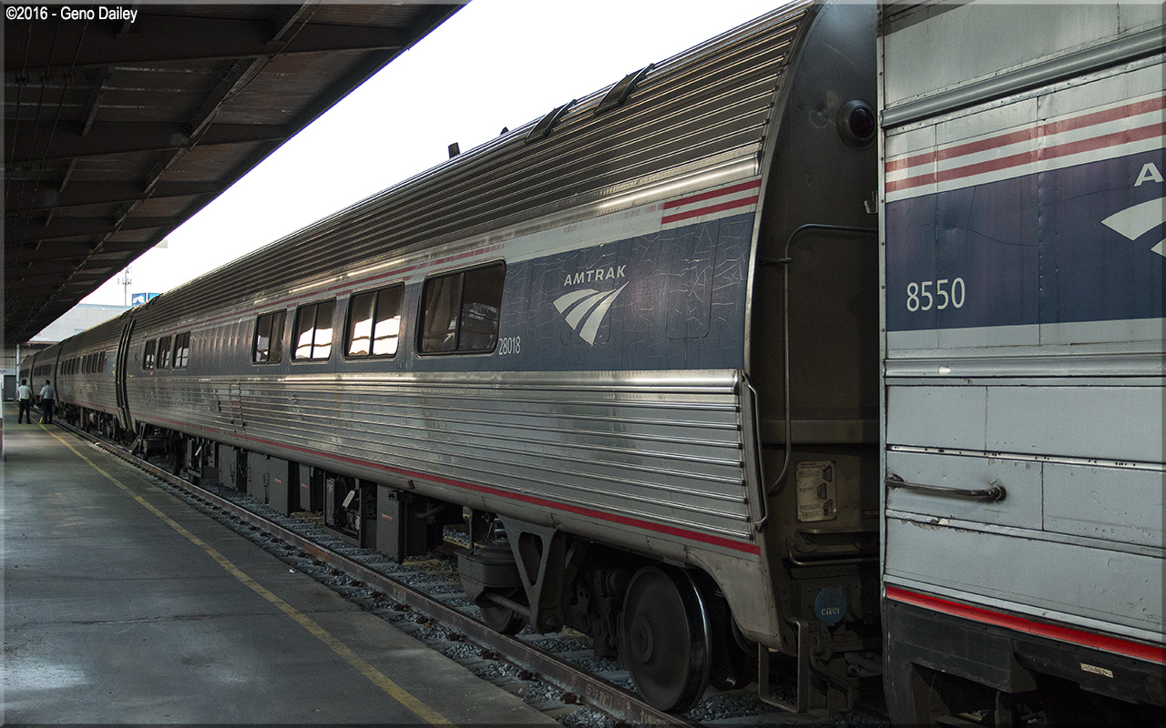 Built by Budd in January 1983 with an off-center snack bar with 10 4-place booths on the long end and 17 seats in 1, 2, and 4 seat configurations on the short end near the restroom and vestibule. Converted to a smoking lounge using the short end of the car in July 1999 and assigned the name "Jacksonville Club". Converted to a "Diner-Lite" car in March 2006 which involved removal of 3 tables on the long end, replaced by a conductor's office and storage space. The short end of the car received 19 seats arranged in two and four-seat booths. A small cooking facility was constructed in the car so these cars could be used as dining cars. Historical information about this car provided by www.amtrakbythenumbers.com. |