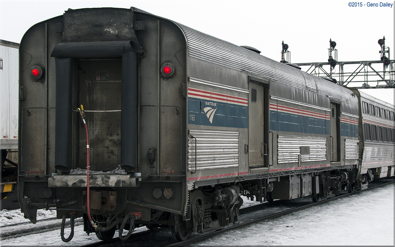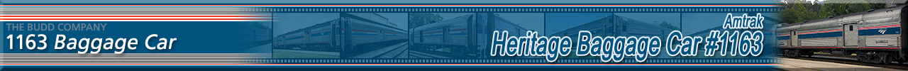 Built by Budd as a baggage car for the Atchison, Topeka & Santa Fe Railway in 1953 and numbered 3654. Conveyed to Amtrak in 1971 and numbered 1104. Converted to Head-End Power from Steam Heat in June 1980 and renumbered 1163. Historical information about this car provided by www.amtrakbythenumbers.com. |