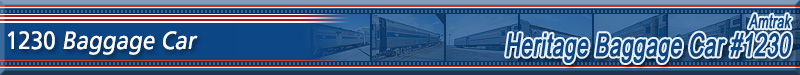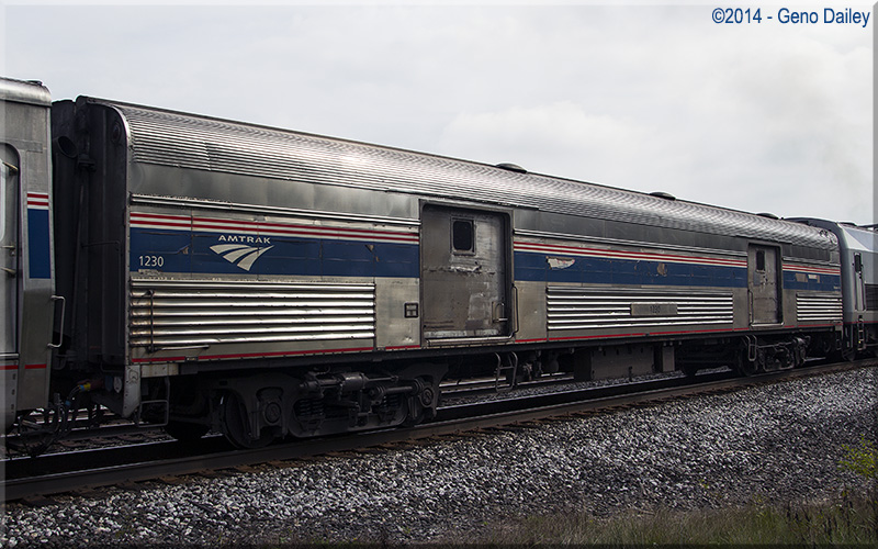 This car was built by Budd for the Santa Fe Railway in 1957 and numbered 3541. Conveyed to Amtrak in 1971 and numbered 1055. Converted from Steam Heat to HEP in February 1978 and renumbered 1230. You can vaguely see the "Santa Fe" markings near the top center of the car in the above photo. Historical Information about this car provided by