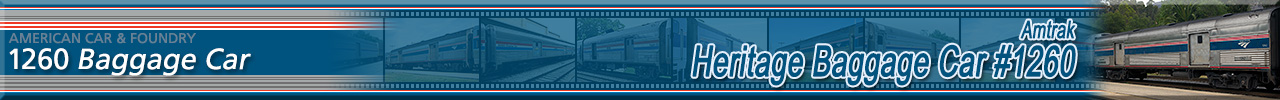 Built by Budd as a baggage car for the Atchison, Topeka & Santa Fe Railway in 1955 and numbered 3667. Conveyed to Amtrak in 1971 and numbered 1155. Converted to Head-End Power from Steam Heat in February 1978 and renumbered 1260. Historical information about this car provided by www.amtrakbythenumbers.com. |