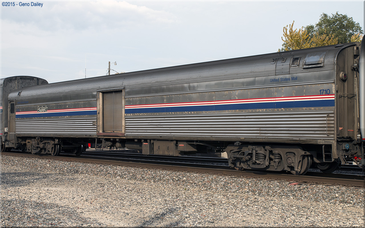 Built by Budd as a 48 seat coach for the Atchison, Topeka & Santa Fe Railway in 1953 and numbered 2836. This car was also equipped with electro-mechanical air conditioning under Santa Fe ownership. Conveyed to Amtrak in 1971 and numbered 4828. Converted to Head-End Power from Steam Heat in March 1980 and renumbered 4715. Converted to a baggage car in September 1996 and renumbered 1710. Historical information about this car provided by www.amtrakbythenumbers.com. |