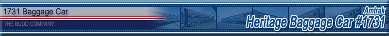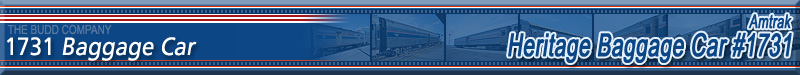 This car was built as a 44 seat coach for the Union Pacific Railroad in 1961. Conveyed to Amtrak in 1971 and numbered 4450, the car operated for several years as a coach having been converted to HEP from Steam Heat in August 1980 and renumbered 4630. The car was converted into a Baggage/Mail car in 1997 with the interior gutted and the windows plated over with a single sliding door installed in the center of the car on each side. With this conversion, the car was renumbered to 1731. The car did retain its original vestibule on one end however the steps that fold out for access to the vestibule on most cars have been replaced by small foot ladders (for crew access) as these cars don't have passengers boarding from them any longer. Historical Information about this car provided by