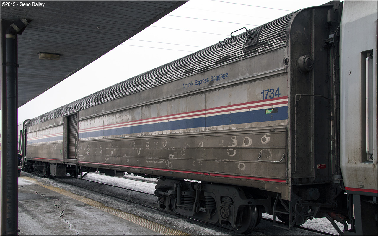 Built by Budd as a 44 Seat Coach built for the Union Pacific Railroad in 1961 and numbered 5514. Conveyed to Amtrak in 1971 and numbered 4446. Converted to Head-End Power from Steam Heat in September 1980 and renumbered 4634. Converted to a baggage car in April 1996 and renumbered 1734. Historical information about this car provided by www.amtrakbythenumbers.com. |