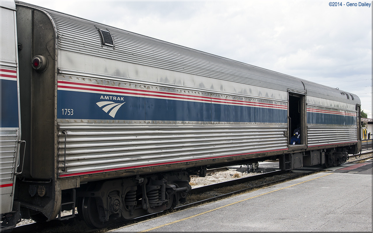 Built by Budd as a 44 seat coach for Southern Pacific Lines in 1954 and numbered 2376. Conveyed to Amtrak in 1971 and numbered 4439. Converted to Head-End Power from Steam Heat in December 1980 and renumbered 4006. Converted to a baggage car in December 1996 and renumbered 1724. Set up for hauling U.S. Mail only and renumbered 1753 in July 2000. Today, the car is used as a normal baggage car. Historical information about this car provided by www.amtrakbythenumbers.com. |