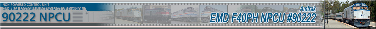 Built by General Motors Electro-Motive Division in April 1976 and numbered 222. Converted to a Non-Powered Control Unit with a baggage room where the prime mover used to be located while retaining its control stand in May 1998 and renumbered 90222. Historical information about this locomotive provided by www.amtrakbythenumbers.com. |