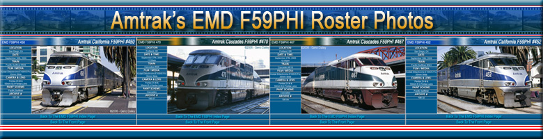 NOTES:Amtrak has a total of 36 of these units. #450-465 are painted up for the Pacific Surfliner Route. #466-470 are used on the Amtrak Cascades Route in the Pacific Northwest and are painted in a green and white paint scheme. #2001-2015 are in Amtrak California colors. |