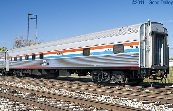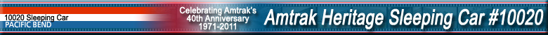 10/6 Sleeper for Union Pacific and converted to a Crew Dorm after years of service as a Sleeper on Amtrak. Retired at the end of 2006, it has been since reactivated, renumbered 10020 and used for special services. Car was selected as the Crew Dorm car for the 40th Anniversary Exhibit train in 2011, repainted back into Phase III paint and given back its original name "Pacific Bend". |