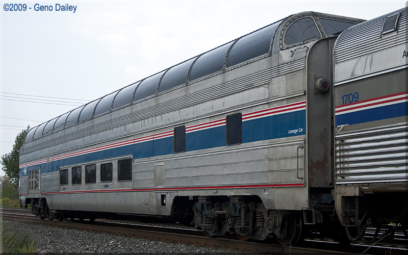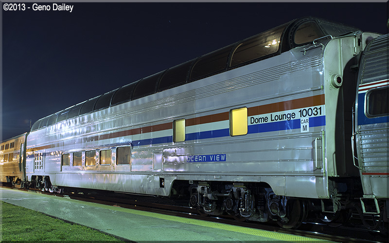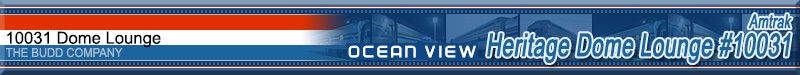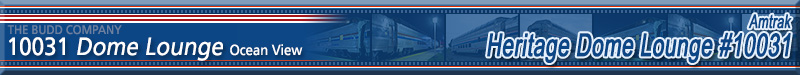 This car was originally built in 1955 by Budd for the Great Northern Railway's Empire Builder train. Conveyed to Amtrak in 1971, the car was numbered 9361. Converted to HEP from Steam Heat in March 1985 and renumbered 9300. Renumbered 10031 in April 1999, the car is now Amtrak's only dome car on the fleet and is used on special trains and is also the featured car on select trains during different times of the year. This car is equipped for food service on the lower level and the entire dome section consists of lounge tables. In 2012, this car was repainted back into Phase III to match Amtrak's 40th Anniversary Exhibit Train. Historical Information about this car provided by www.amtrakbythenumbers.com.