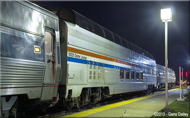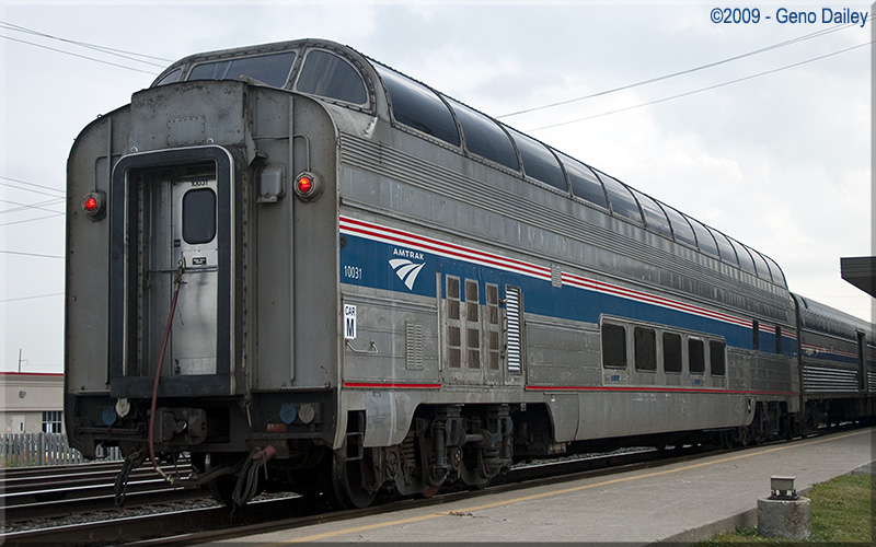 This car was originally built in 1955 by Budd for the Great Northern Railway's Empire Builder train. Conveyed to Amtrak in 1971, the car was numbered 9361. Converted to HEP from Steam Heat in March 1985 and renumbered 9300. Renumbered 10031 in April 1999, the car is now Amtrak's only dome car on the fleet and is used on special trains and is also the featured car on select trains during different times of the year. This car is equipped for food service on the lower level and the entire dome section consists of lounge tables. Historical Information about this car provided by www.amtrakbythenumbers.com.