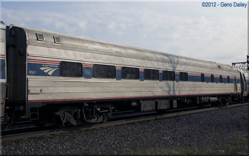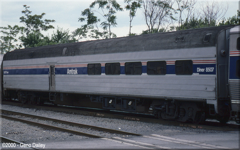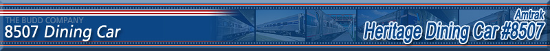 This car was originally built in 1957 by Budd for the Northern Pacific Railway's North Coast Hiawatha and conveyed to Amtrak in 1971. Amtrak renumbered the car 8049 and in March 1980 converted it from Steam Heat to HEP and renumbered it 8507. The car operates today as a Heritage Diner with the full Temoinsa Rebuild interior. Historical Information about this car provided by www.amtrakbythenumbers.com.