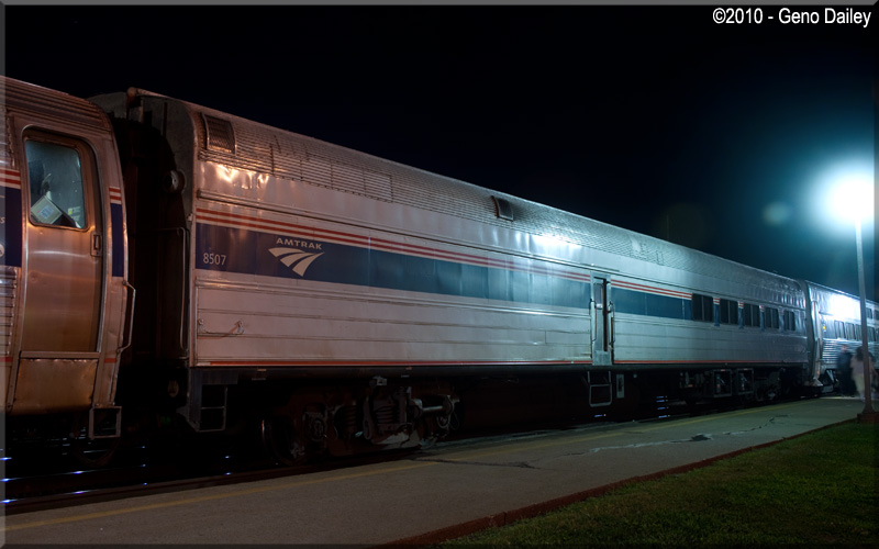 This car was originally built in 1957 by Budd for the Northern Pacific Railway's North Coast Hiawatha and conveyed to Amtrak in 1971. Amtrak renumbered the car 8049 and in March 1980 converted it from Steam Heat to HEP and renumbered it 8507. The car operates today as a Heritage Diner with the full Temoinsa Rebuild interior. This was an experimental night photo I took of the car in the consist of the Lake Shore Limited. Historical Information about this car provided by www.amtrakbythenumbers.com.