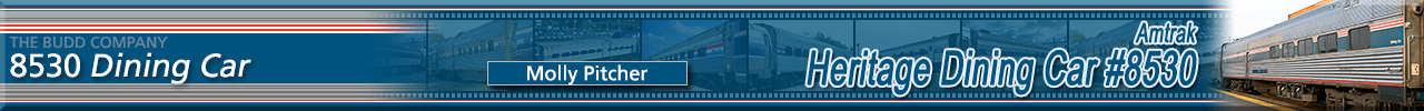 Built by Budd as a Parlor Car with revolving chairs in 1951 for the Pennsylvania Railroad and numbered 7143 and named "Molly Pitcher". Amtrak acquired the car from the Penn Central Railroad and renumbered it 3643. Converted to a Galley lounge car in 1973 and renumbered 3321. Converted to a cafeteria car and also underwent conversion to Head-End Power from Steam Heat in November 1983 and renumbered 8702. Converted to a regular Heritage Diner in October 2000 and renumbered 8530. Historical information about this car provided by www.amtrakbythenumbers.com. |