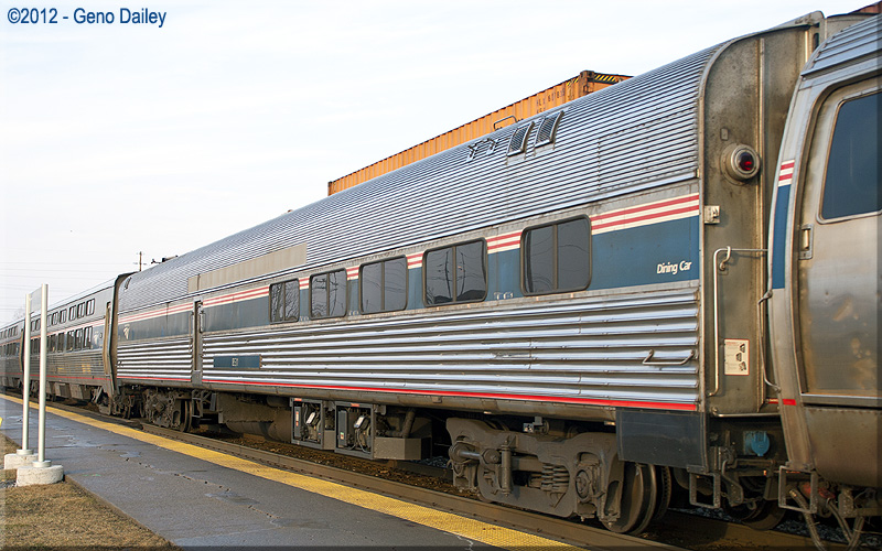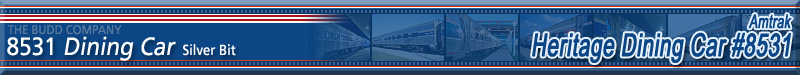 This car was originally built as a 50 seat coach for the Chicago, Burlington & Quincy Railway. Conveyed to Amtrak in 1971, the car was connverted into a Dining Car in and renumbered 8711. Converted to HEP from Steam Heat in June 1985, the car today wears the number 8531. You can see where the vestibule used to be located on the car on the right side by the presense of the bolts in the stainless steel near the roof of the car. The car originally had the name "Silver Bit" but as a diner today doesn't sport a car name. Historical Information about this car provided by www.amtrakbythenumbers.com.. |