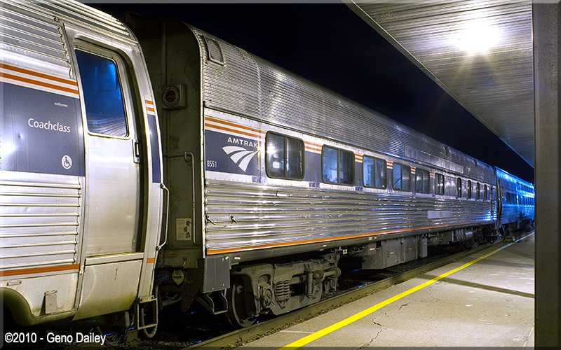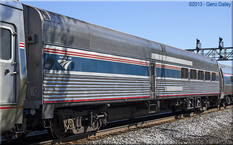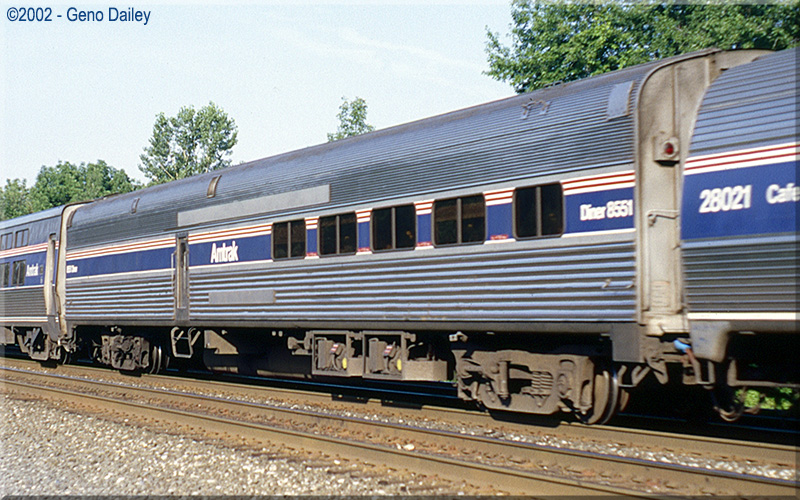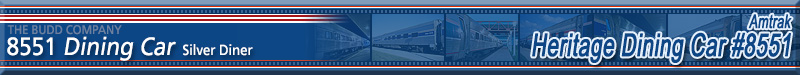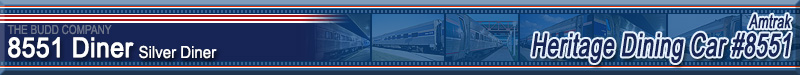 This car was originally built in 1948 by Budd for the Chicago, Burlington & Quincy Railroad. The car was conveyed to Amtrak in 1971 and renumbered 8051. Converted from steam heat to HEP in September 1979 and renumbered 8500. Converted to a Griddle Diner in January 1987 and renumbered 8551. In the early 2000's, the car had the full Temoinsa Rebuild nterior consisting of green seating and green and pink walls and ceiling. Historical Information about this car provided by