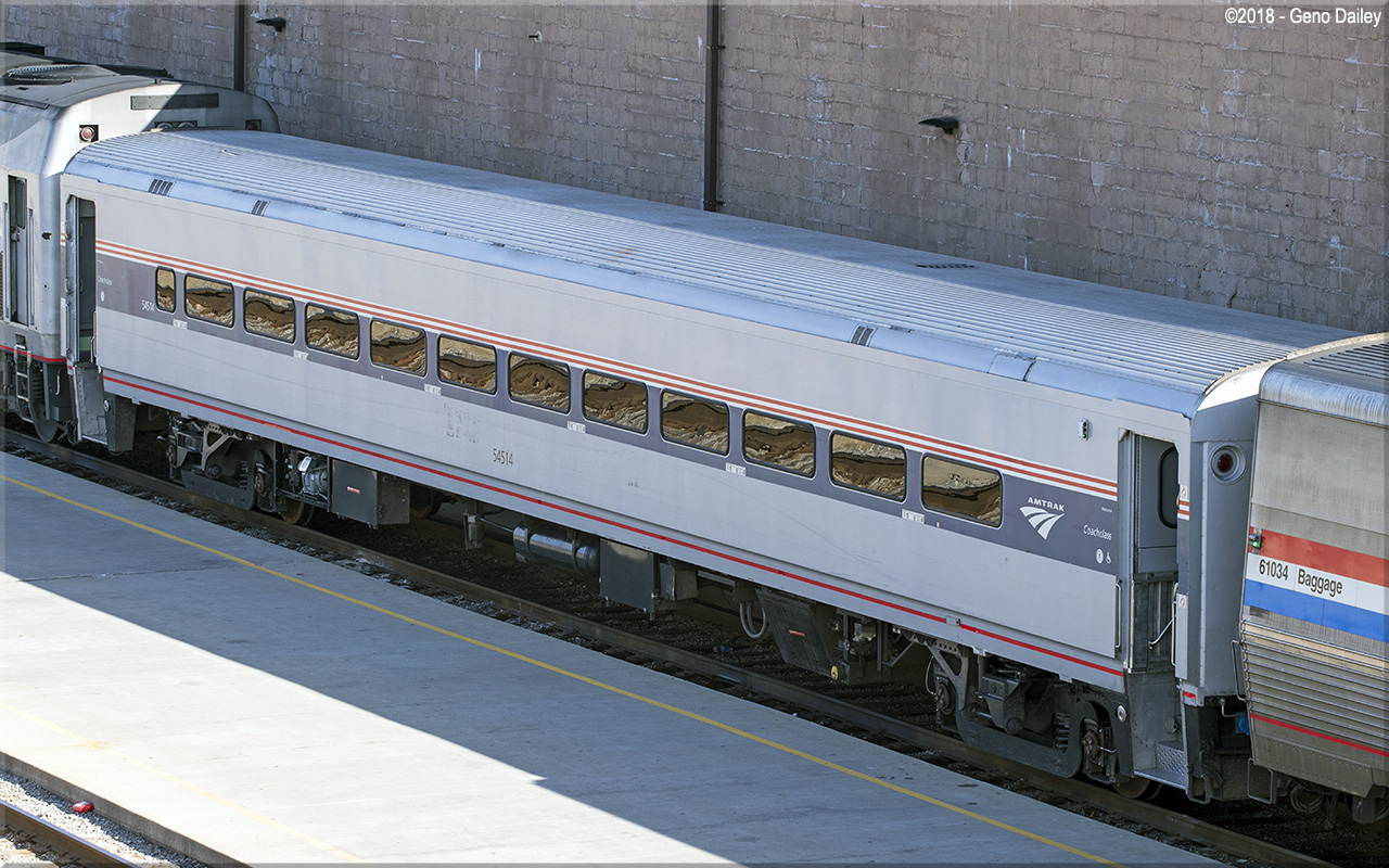 Built by Bombardier as an 82 seat coach in 1989 and numbered 54014. Converted to an ADA-compliant 68 seat coach in November 1995 and renumbered 54514. Historical information about this car provided by www.amtrakbythenumbers.com. |