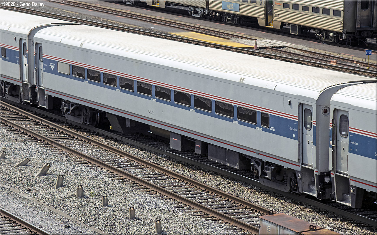 Built by Bombardier as an 82 seat coach in 1989 and numbered 54022. Converted to an ADA-compliant 68 seat coach in August 1995 and renumbered 54522. Historical information about this car provided by www.amtrakbythenumbers.com. |