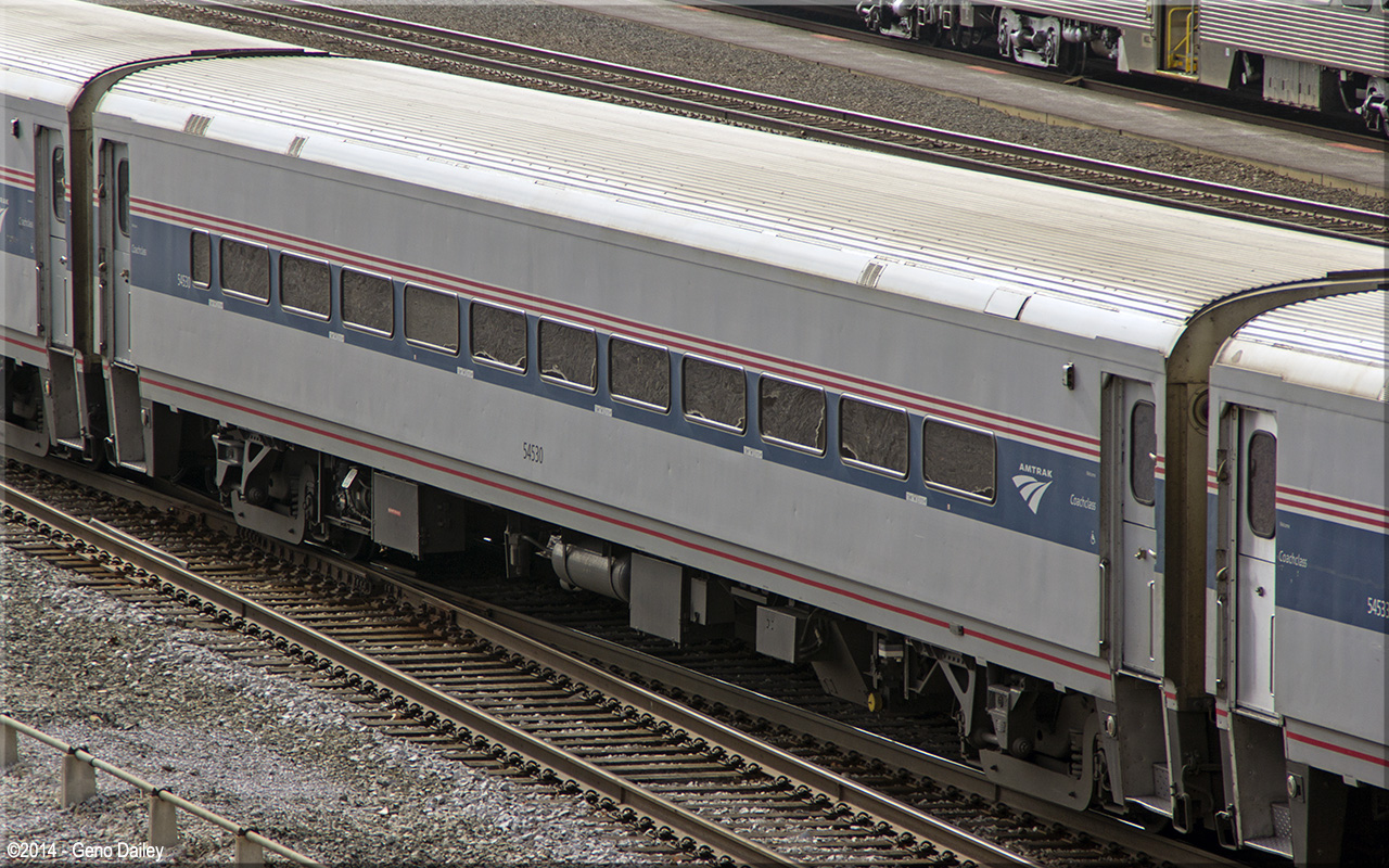 Built by Bombardier as an 82 seat coach in 1989 and numbered 54030. Converted to an ADA-compliant 68 seat coach in January 1996 and renumbered 54530. Historical information about this car provided by www.amtrakbythenumbers.com. |