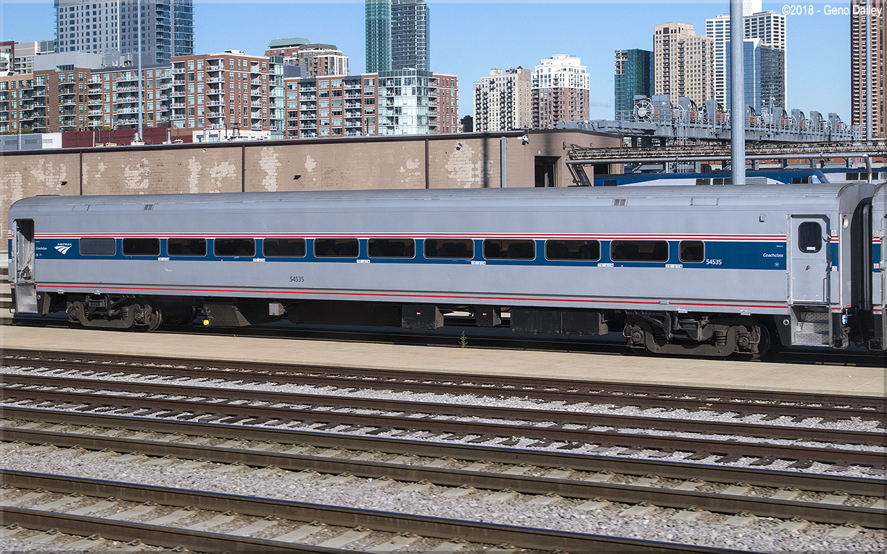 Built by Bombardier as an 82 seat coach in 1989 and numbered 54035. Converted to a 68 seat ADA coach in April 1996 and renumbered 54535. Historical information about this car provided by www.amtrakbythenumbers.com. |