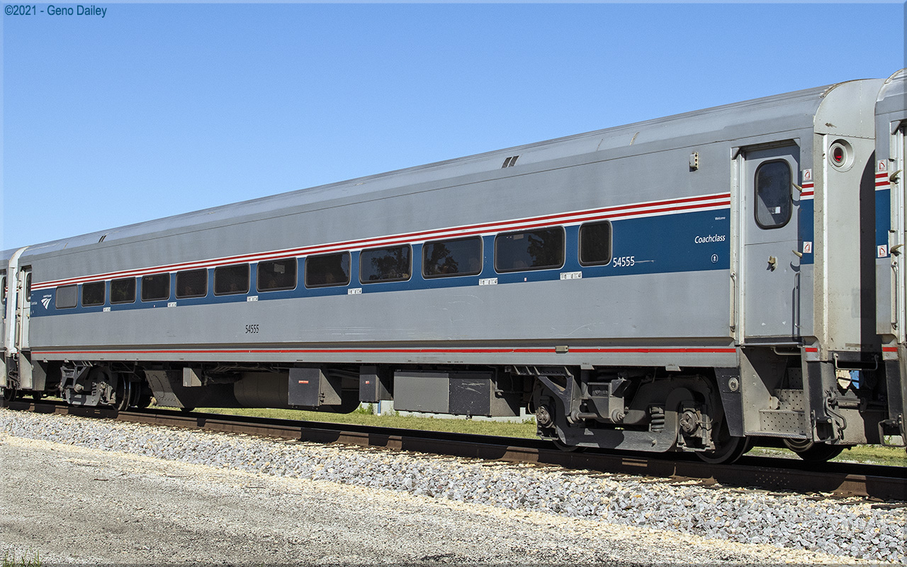 Built by Bombardier as a 76 seat coach in 1989 and numbered 54055. Converted to a 68 seat ADA coach in December 1995 and renumbered 54555. Historical information about this car provided by www.amtrakbythenumbers.com. |