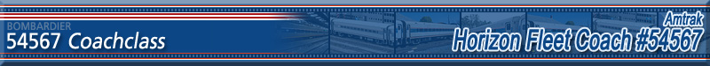 Originally built as an 76 seat coach, it was converted into a 68 seat ADA coach and renumbered 54567. Historical information about this car provided by www.amtrakbythenumbers.com. |