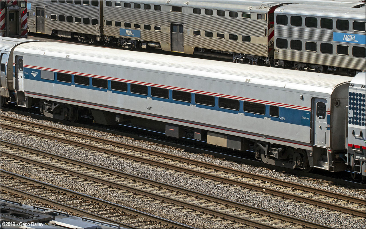 Built by Bombardier as a 76 seat coach in 1989 and numbered 54070. Converted to an ADA-compliant 68 seat coach in November 1996 and renumbered 54570. Historical information about this car provided by www.amtrakbythenumbers.com. |