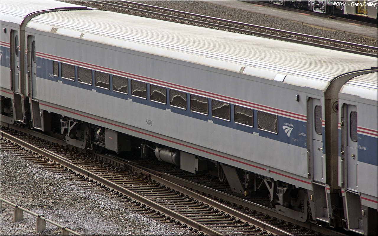 Built by Bombardier as an 82 seat coach in 1989 and numbered 54001. Converted to an ADA-compliant 68 seat coach in October 1995 and renumbered 54573. Historical information about this car provided by www.amtrakbythenumbers.com. |