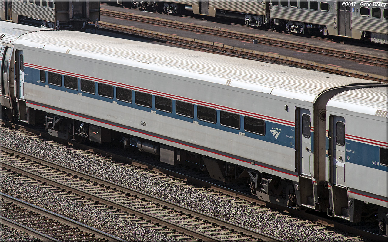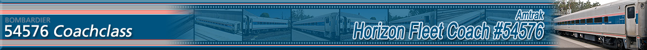 Built by Bombardier as an 82 seat coach in 1989 and numbered 54013. Converted to an ADA-compliant 68 seat coach in May 2009 and renumbered 54576. Historical information about this car provided by www.amtrakbythenumbers.com. |