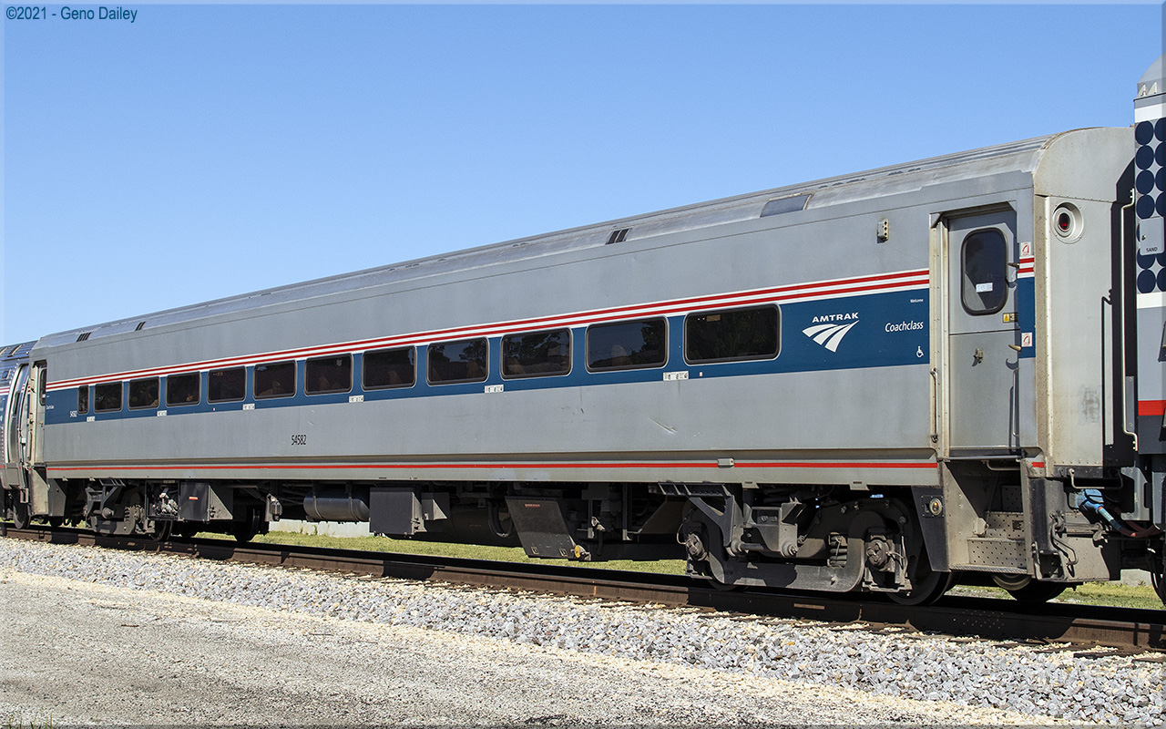 Built by Bombardier as an 82 seat coach in 1989 and numbered 54010. Converted to a 68 seat ADA coach in August 1996 and renumbered 54539. Historical information about this car provided by www.amtrakbythenumbers.com. |
