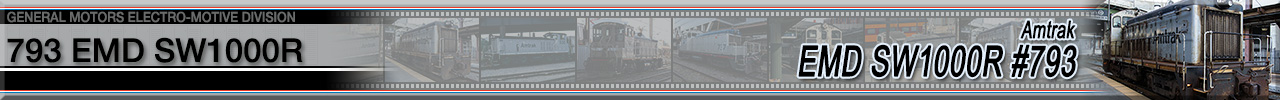 Built by General Motors Electro-Motive Division in January 1953 as an SW9 for use on the Montour Railroad and the Youngstown & Southern Railroad. Later owned by Inland Steel and numbered 135. It was later rebuilt with a 645E prime mover and is now known as an SW1000R. Amtrak eventually acquired it and numbered it 793. Historical information about this locomotive provided by www.amtrakbythenumbers.com. |