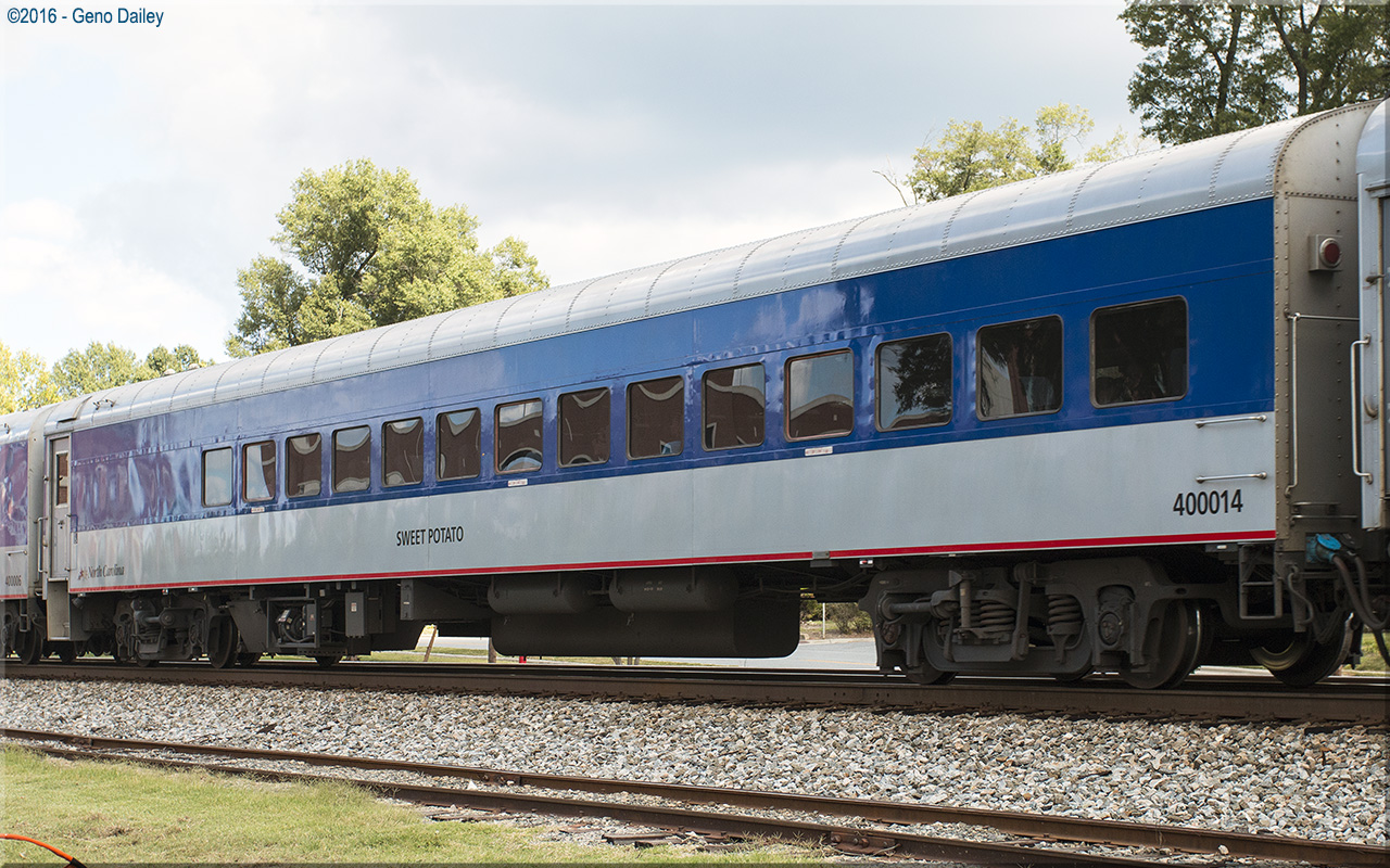 Built by St. Louis Car in 1960 as a 45 seat coach for the Union Pacific Railroad and numbered 5501. Conveyed to Amtrak in 1971 and numbered 4561. Converted to Head-End Power from Steam Heat in November 1979 and renumbered 4623. Retired in June 2002 and eventually purchased by the State of North Carolina. Refurbished by the Delaware Car Company for the NCDOT and renumbered 400014 and named "Sweet Potato". Historical information about this car provided by www.amtrakbythenumbers.com and the North Carolina Department Of Transportation. |