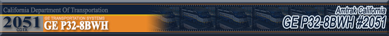 Originally delivered to Amtrak, this unit was sold to the state of California and renumbered to its present #2051. Historical information about this locomotive provided by www.amtrakbythenumbers.com.