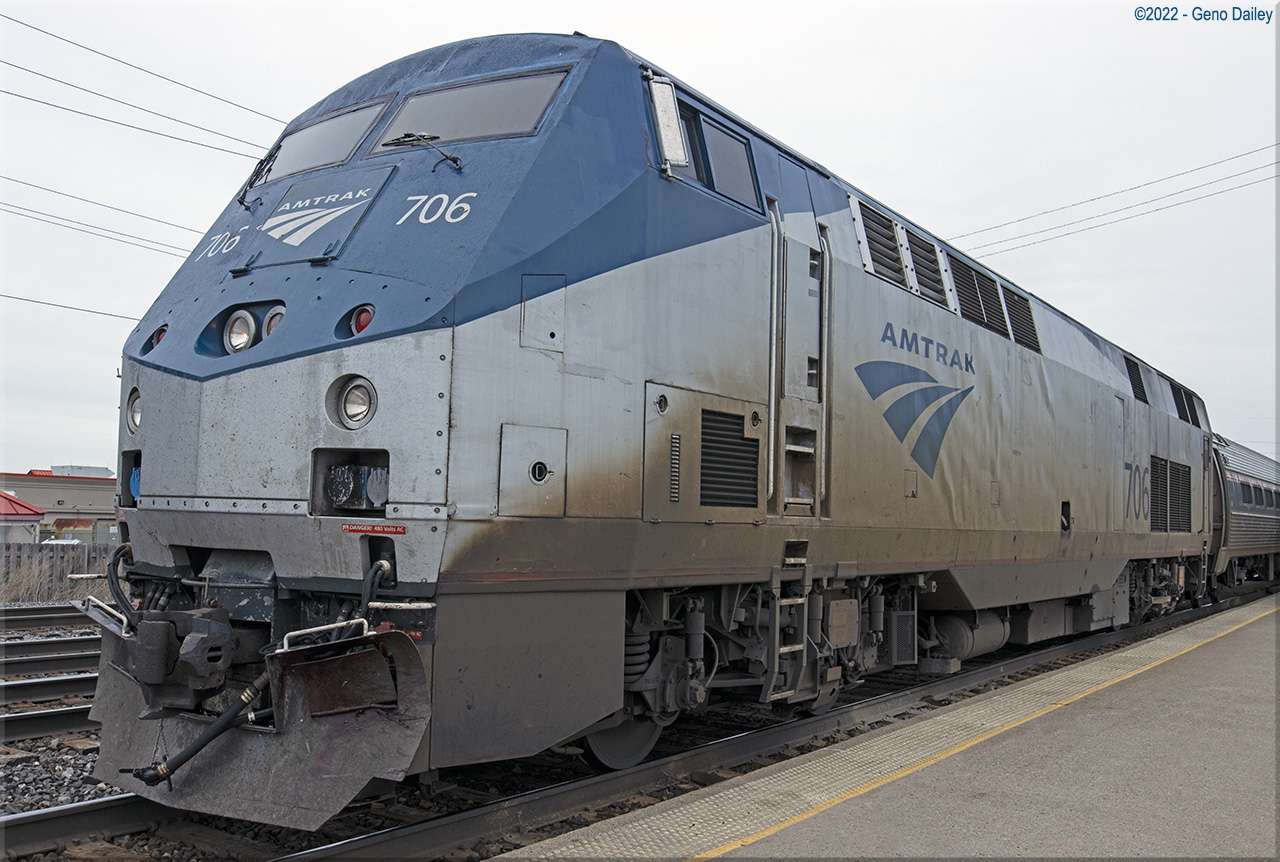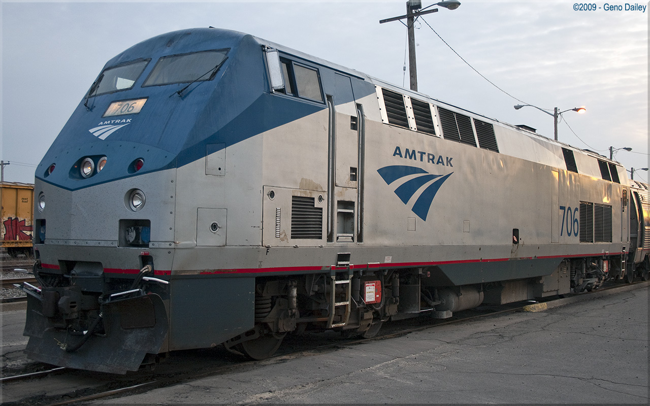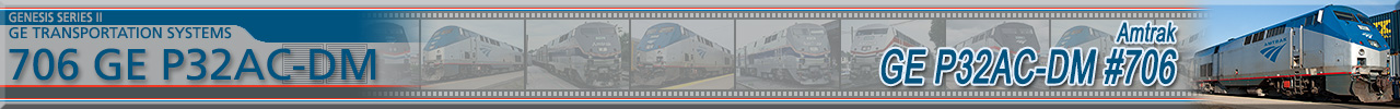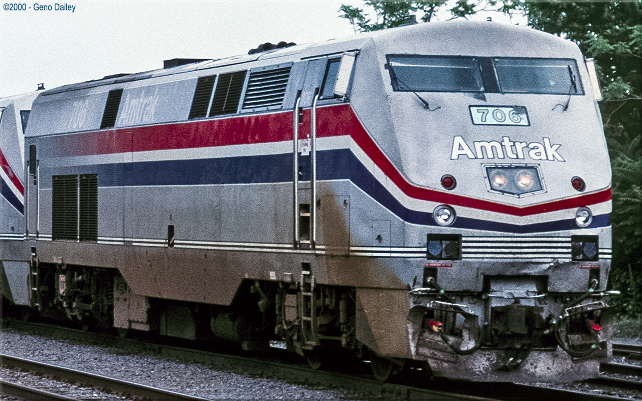 Built by General Electric Transportation Systems in August 1995 and numbered 706. This series of locomotives (a total of 18 would be built) were built to replace the EMD FL9's. These "Dual-Mode" units were built to operate on diesel power above-ground and on third-rail electric power when in the tunnels going into New York's Penn Station. Historical information about this locomotive provided by www.amtrakbythenumbers.com. |